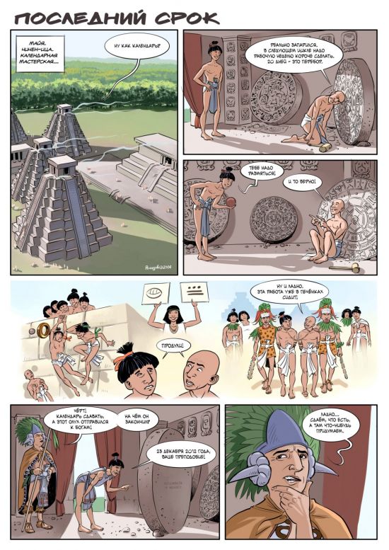 Если так подумать, календарь Майя заканчивается в декабре 2012 года, быть может они просто не смогли его продолжить, потому что таинственным бразом их цивилизация исчезла оО А люди стали выдумывать различные тому причины типо "конца света". Но так же и у славян есть свой календарь эпох, он называется календарь Коляды. И по этому календарю в 2012 году тоже заканчивается эра – эра Лисы – эра лжи.Но затем наступает эра Волка. Заметьте заканчивается одна эра, но это ведь не значит, что должен быть конец света. Точно так же и другие цивилизации ссылаются на конец 2012 года и различные катаклизмы. Не факт, что всё так и будет.
